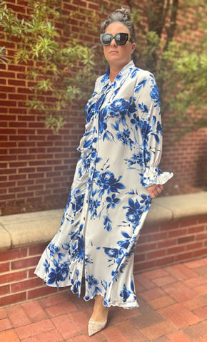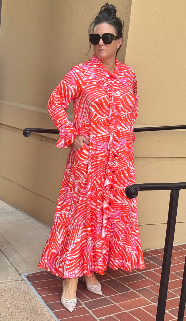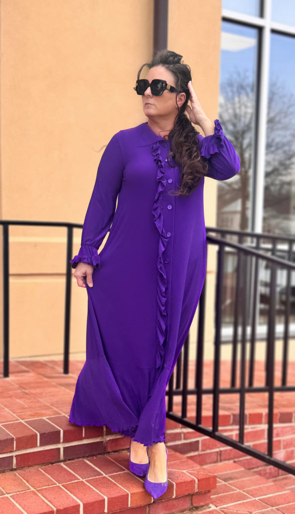 The Jacqueline Ruffled Dress truly embodies the essence of femininity and delicacy, making it a standout piece. With its elegantly designed A-Line cut, this dress drapes beautifully, allowing for graceful movement. The charming button-down front, embellished with a lovely lettuce ruffle, harmonizes perfectly with the ruffled cuffs of the sleeves, adding a touch of whimsy and sophistication. Practicality meets style with functional pockets on both sides, providing convenience without compromising on aesthetics. The unique swallow-tailed collar elevates the overall design, while the single flowing ruffle at the hem adds a delightful finishing touch. Designed from our signature knit fabric, this dress offers a generous fit that ensures comfort and ease, making it a perfect choice for any special occasion. Available in four delightful colors.