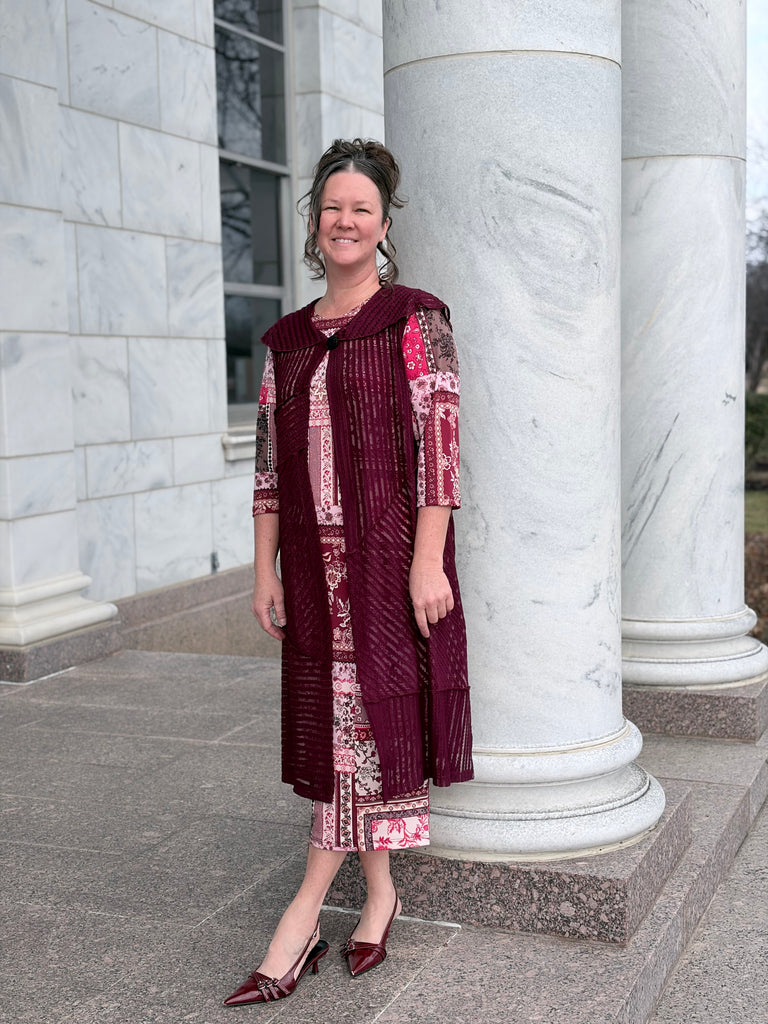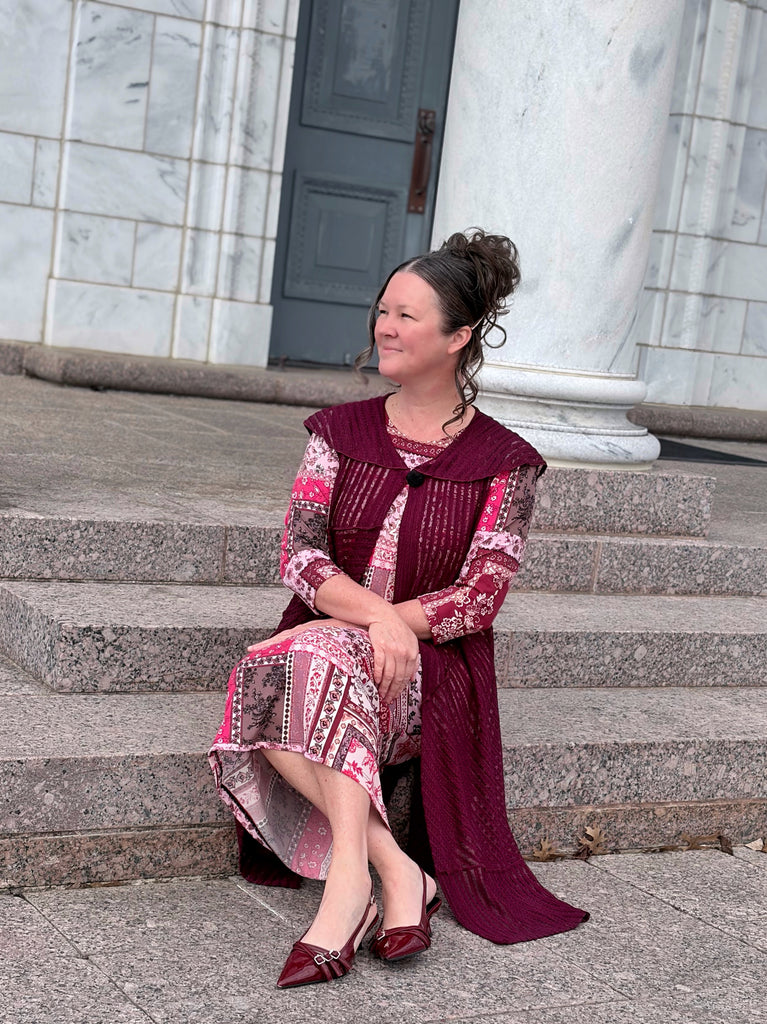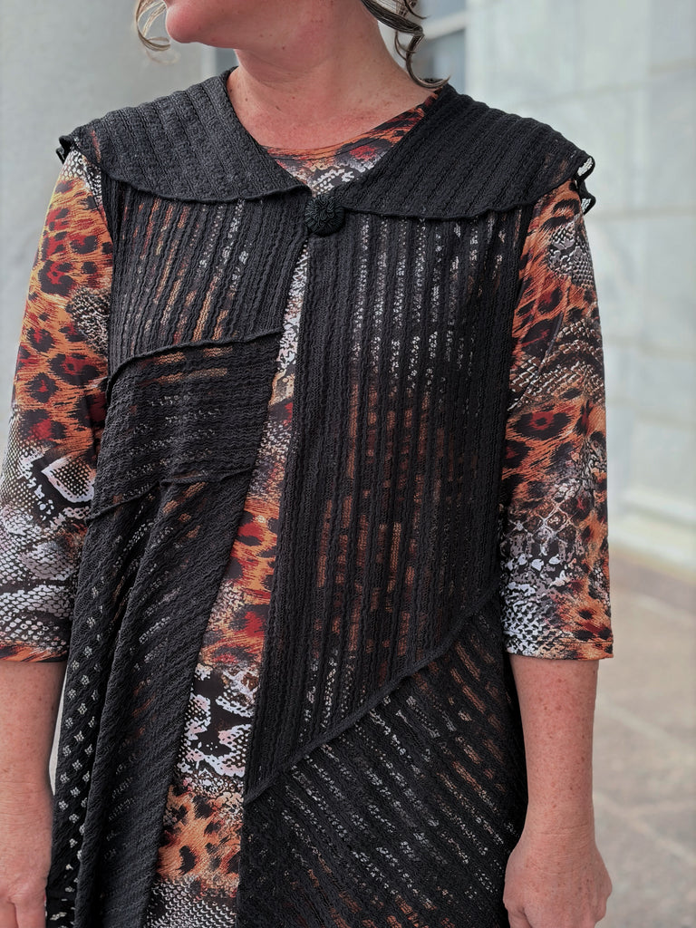 Complete your look with our stunning Amere Lace Vest. It has a shawl collar accented by a beautiful, knot button closure. The textured mesh lace not only offers exceptional coverage but also showcases the underlying garment, creating a balance between modesty and charm. It has a slightly longer silhouette and chic side slits, making it a fabulous piece to layer with a number of our garments.