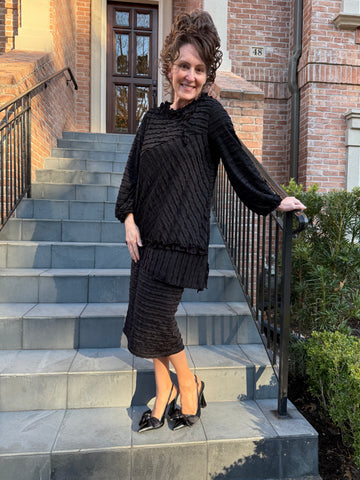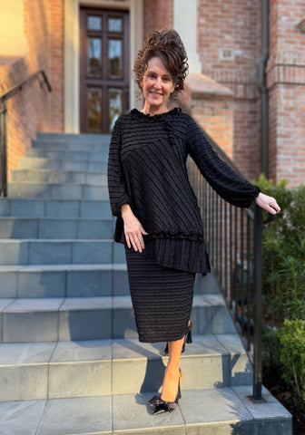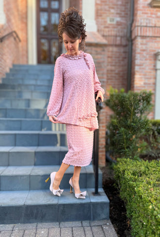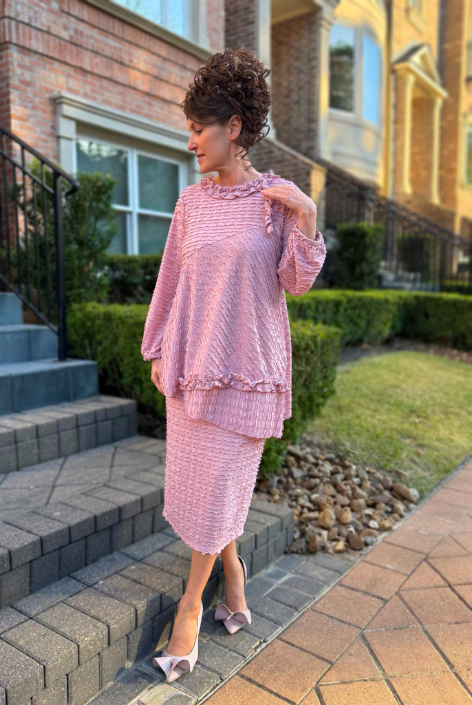The Celeste 2-Piece Set is absolutely gorgeous. The fabric of this set has an ever-so delicate scalloped ruffle that is sewn throughout to create an elegant appeal. It has a round ruffled neckline that is accentuated by a small coordinating tab streaming down the side and long sleeves that boast the same ruffle accents around the wrist. The bust has a diagonal seam that is mirrored near the bottom of the top, creating an asymmetrical hem line. For added flair, a super cute ruffle is placed just slightly above the hem, and side slits are perfectly placed on each side to create extra movement. The set is elevated to the next level with the matching pencil skirt that is also made from the same delicate material. The Celeste is truly more magnificent than words can describe and is appropriate for so many special occasions.