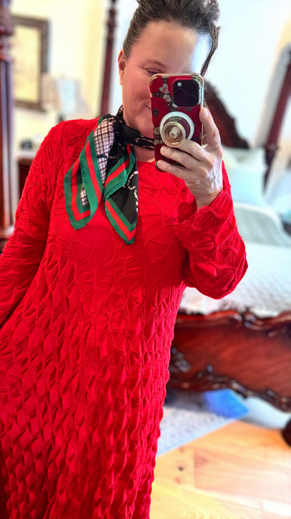 If you are looking for the perfect special occasion dress, look no further because the Lana Ruched Dress promises to hit the mark. Made from luxurious ruched fabric, this stunning piece not only offers a flattering silhouette but also ensures graceful movement, allowing you to exude elegance. It is a maxi-length dress with a rounded neckline and long sleeves, complemented by a delicate lettuce hem, which creates a captivating look that is both timeless and modern. This dress does run generous.