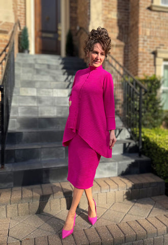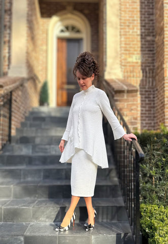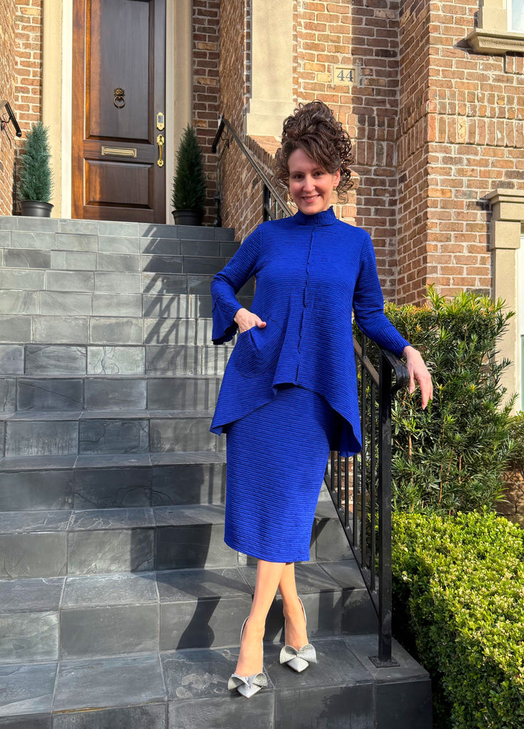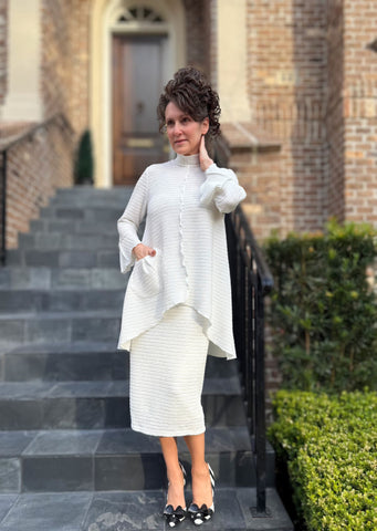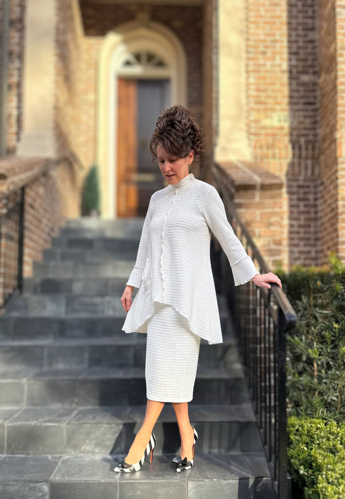 Get ready to fall head over heels for the Krissy Mock Neck Tunic! This fabulous piece is a showstopper, featuring an eye-catching exposed surged seam that runs gracefully down the front, perfectly accentuating the gorgeous textured fabric. The fantastic zipper that elegantly descends from the back of the neck adds a touch of flair. And those lettuce edge cuffs? Pure perfection! They drape so delicately, adding a classy touch to your look. To top it all off, a charming, pleated pocket, perfectly placed diagonally on one side, makes this tunic not just stylish but irresistibly darling. *Please note that the Alabaster tunic is not lined; therefore, we recommend wearing a light colored under garment and or a shell for modesty purposes.