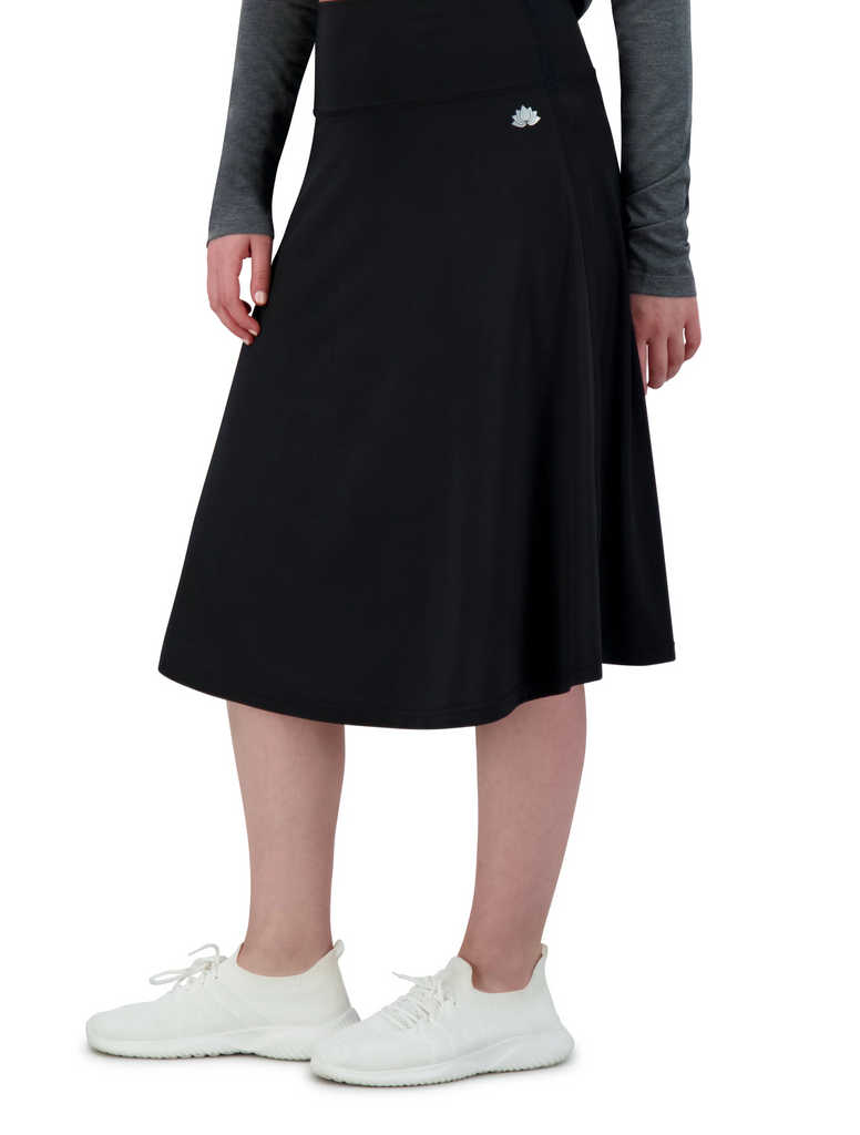 Snoga Athletics light weight basic pull on skirt is great as a modest tennis skirt with its design as a fit and flare. The material lays flat on the stomach and then softly flares. The material is a poly spandex that can be worn in the day with a t-shirt as well as by night with a blouse or sweater. It's the perfect modest clothing skirt to pack for a get-away as it is truly multi-purpose. There are no attached leggings, but can be paired with leggings while working out or be your everyday basic in your selection of women's modest clothing. Skirt features a large zipper pocket on back of waist band.