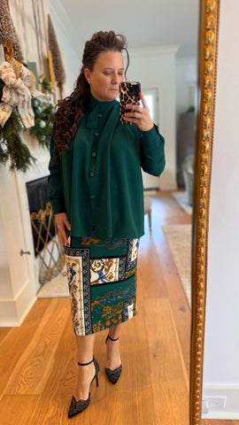 If you are looking for elegance, then look no further because the Aniston Pleated Top will check all of the boxes. Draping with pleats from the shoulders and flowing down the front, this top is an absolute showstopper. It has long sleeves with a button cuff and a cute accent pleat. It has a button front with a tab collar that boasts a small piece of fabric that lies so delicately across the neck. It comes in two spectacular colors that pair beautifully with many of our great skirts.